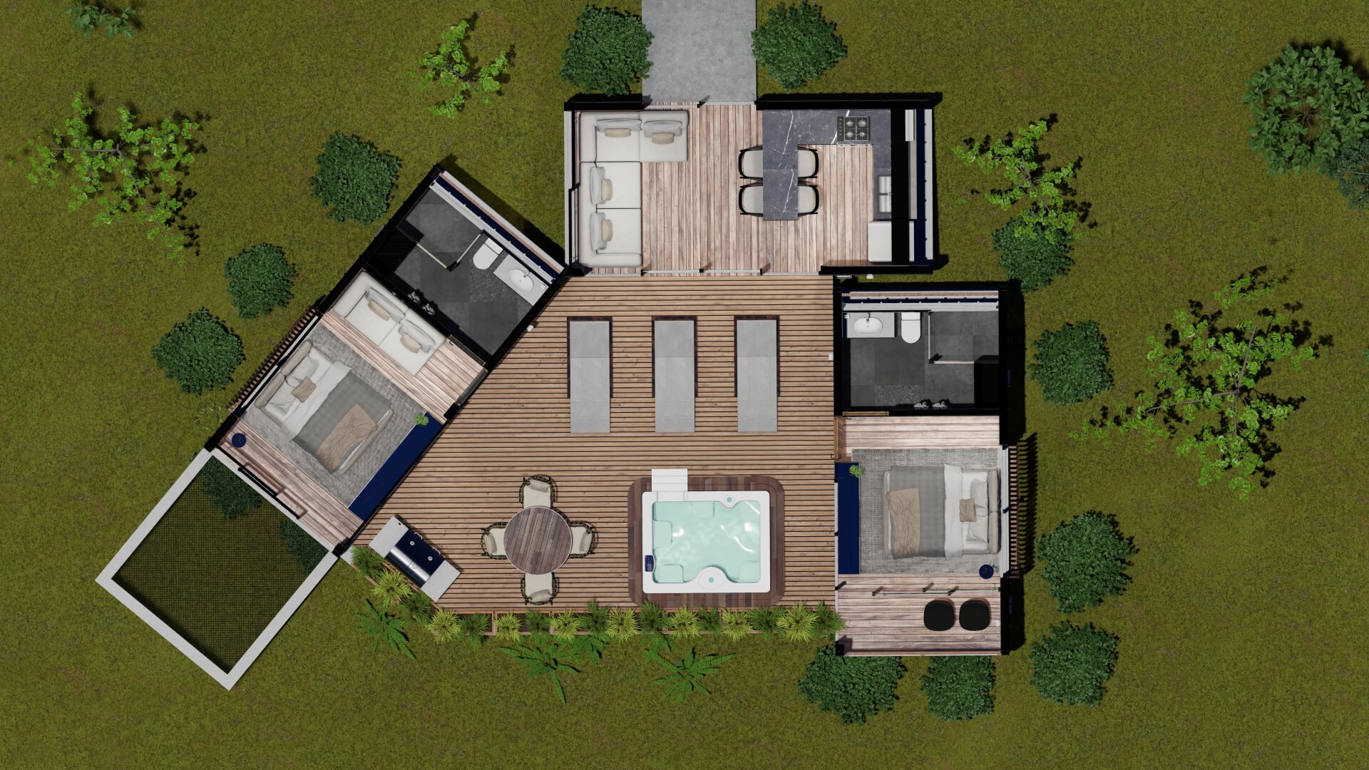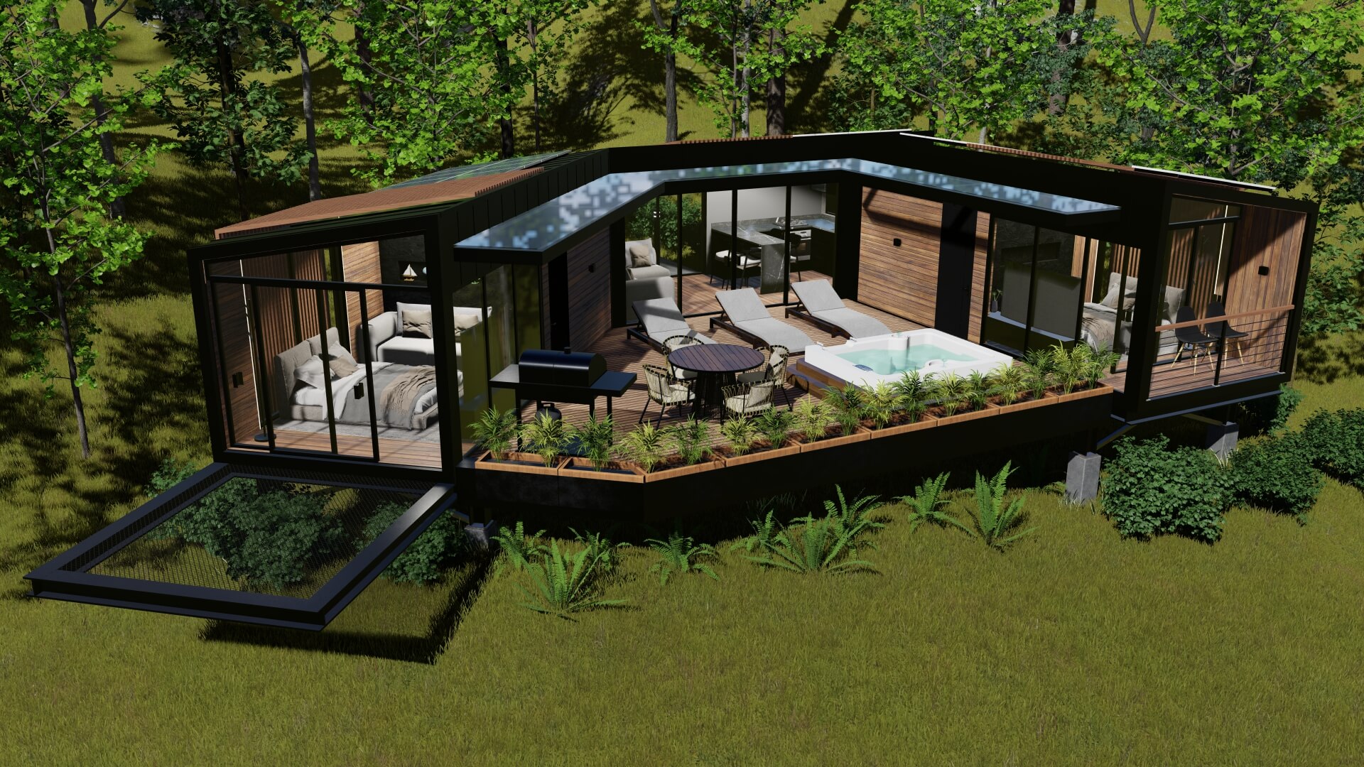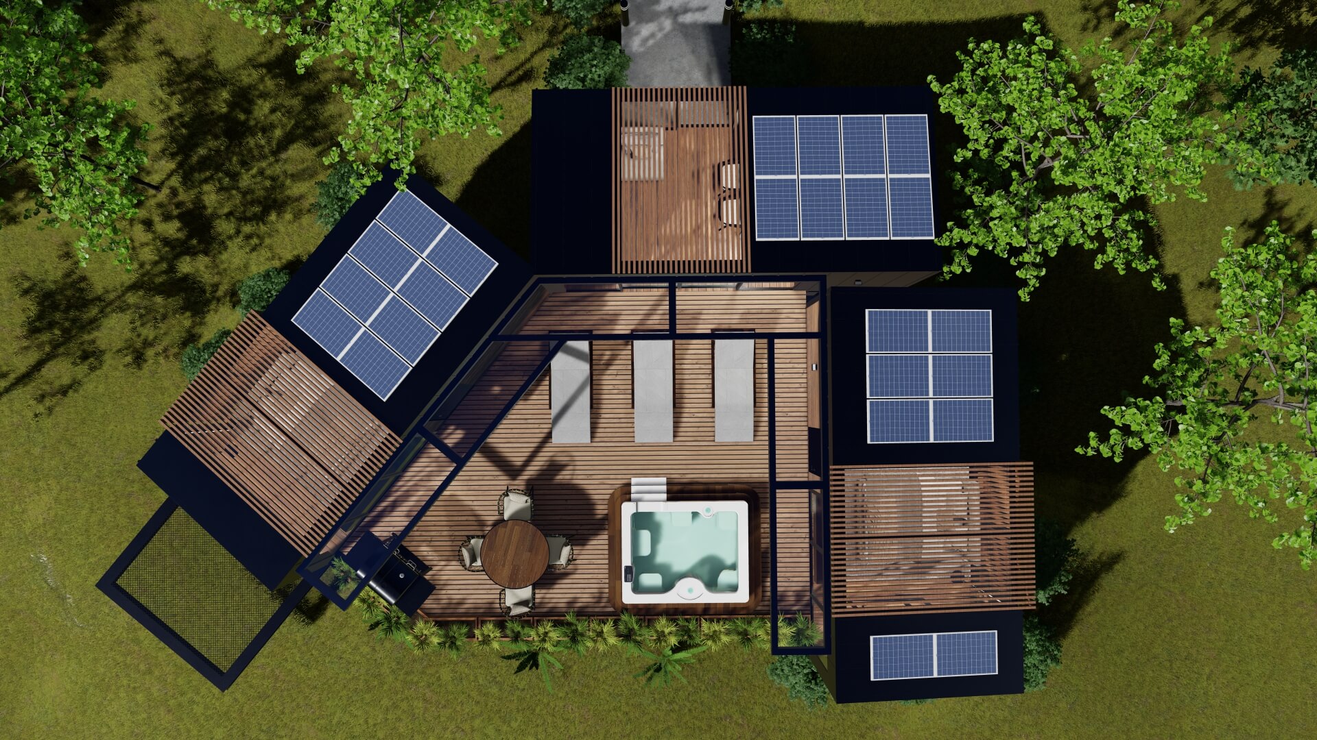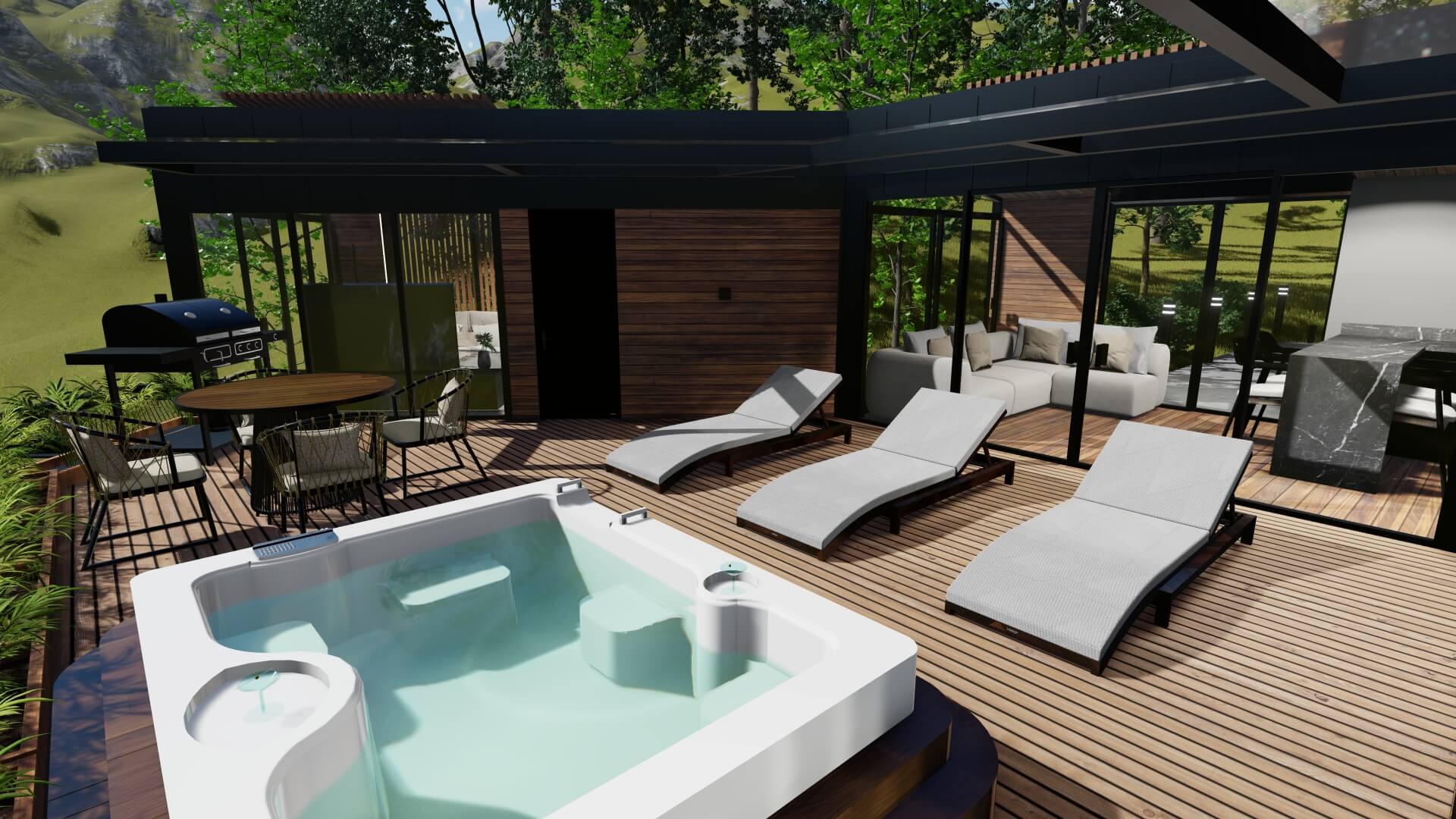 Medidas del Proyecto: 3 módulos 6m x 3m – 54m2 Terraza exterior DECK – 40m2 Jacuzzi – 6 m2 Área 100m2