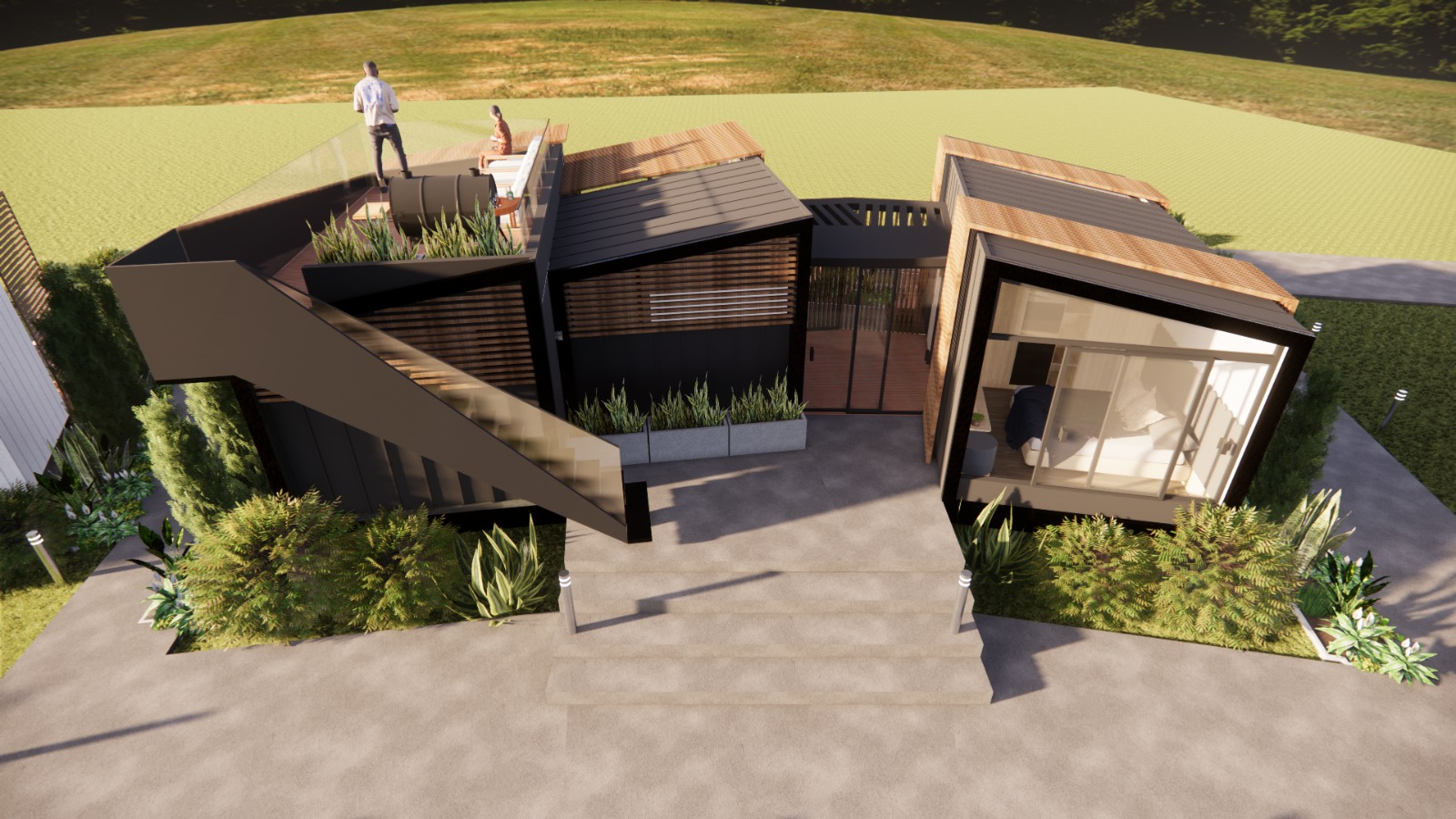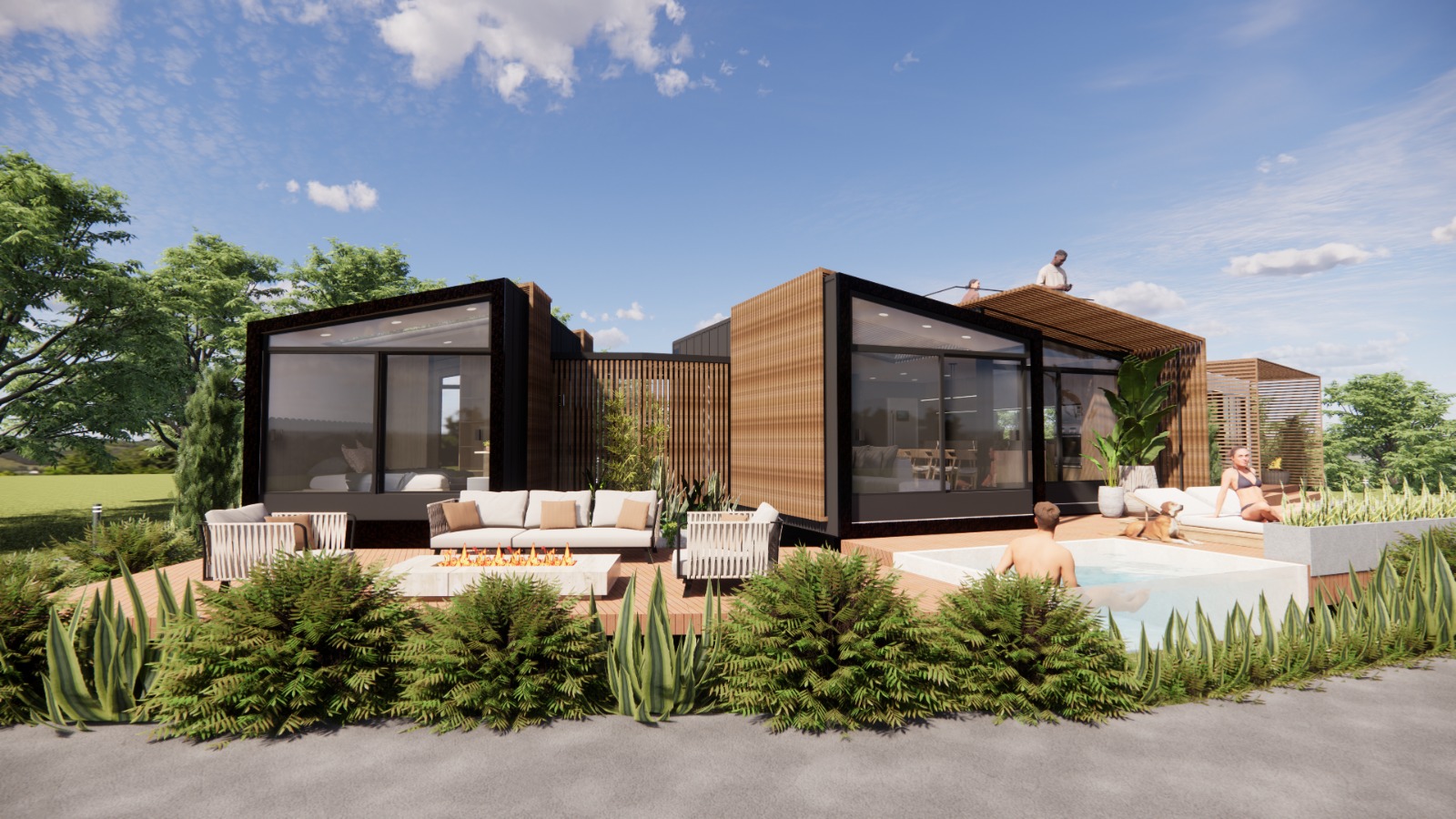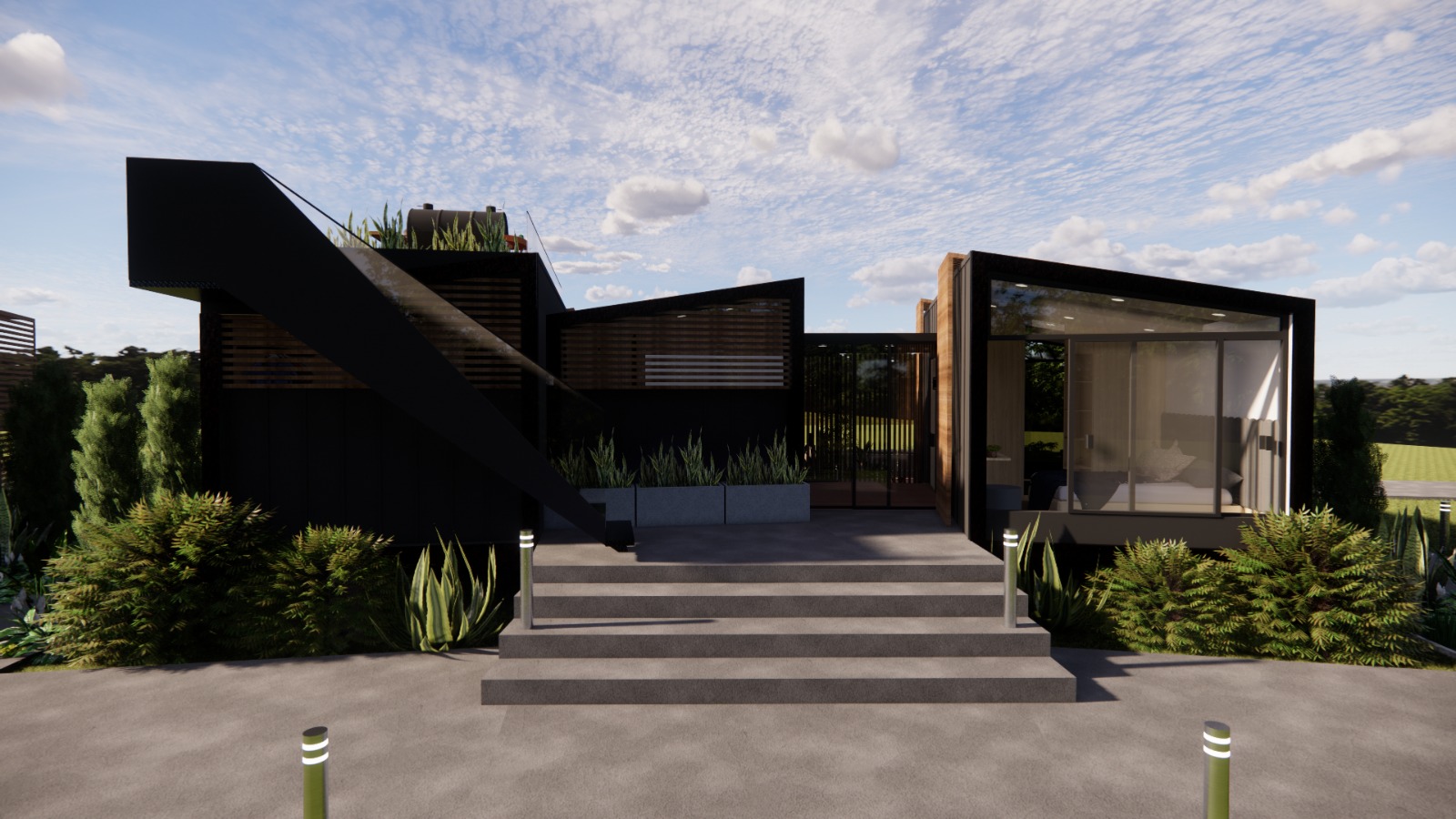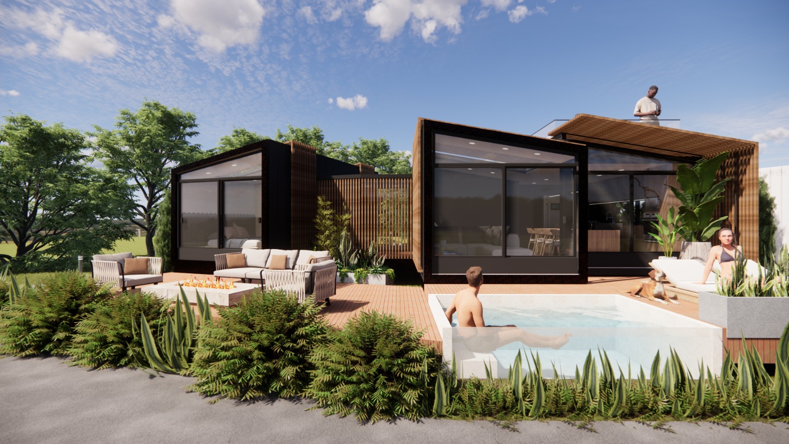 Medidas del Proyecto: 3 módulos 6m x 3m – 54m2 Lobby de acceso – 6m2 Terrazas exteriores DECK – 40m2 Cuerpo de agua – 6m2 Área 106m2