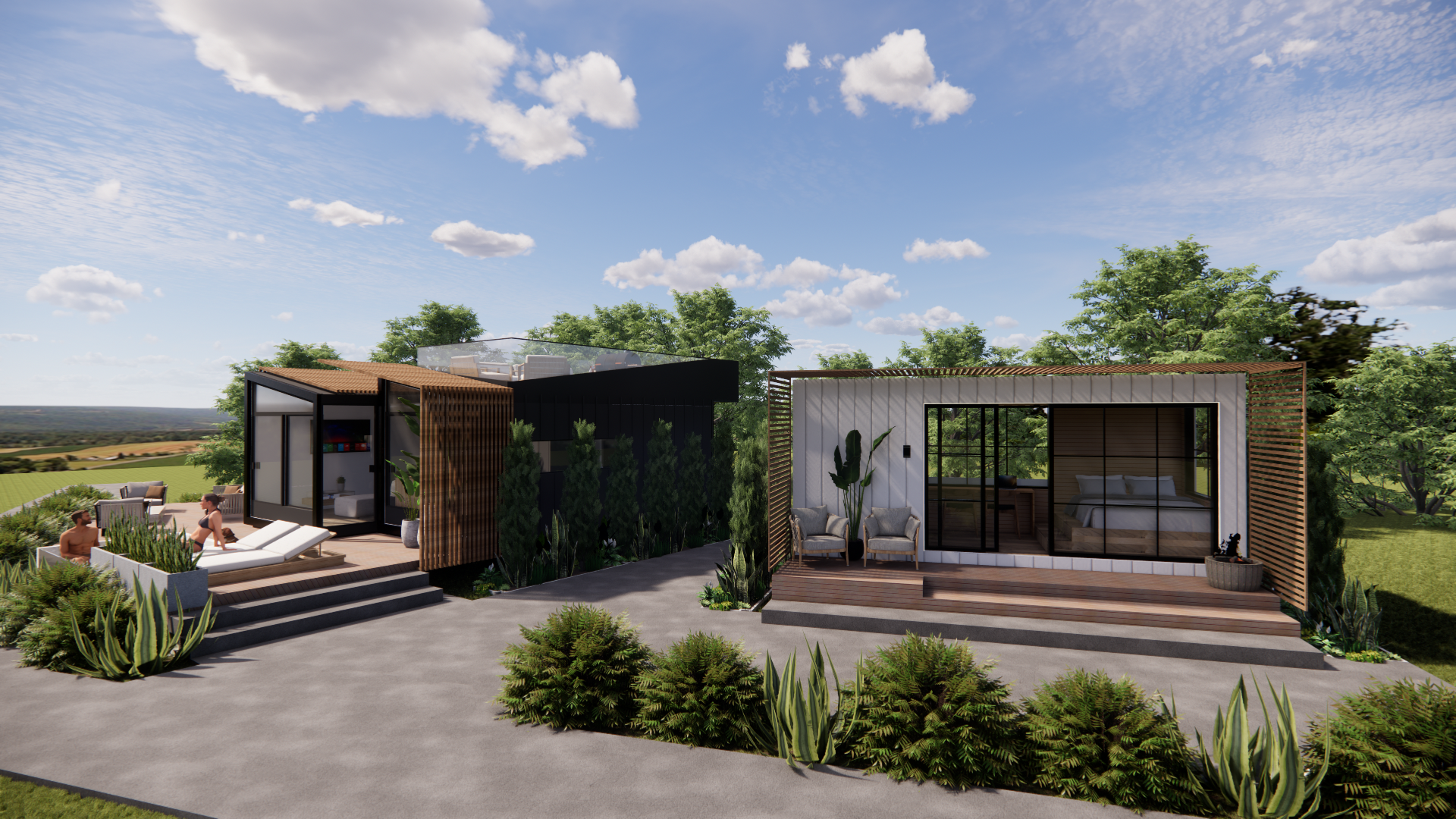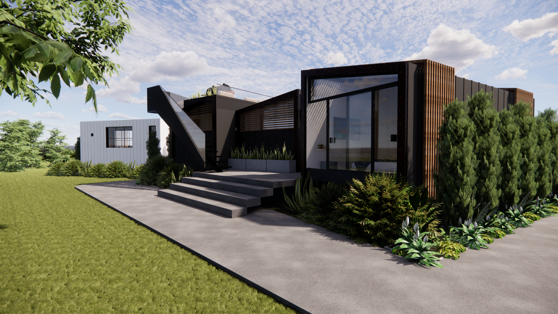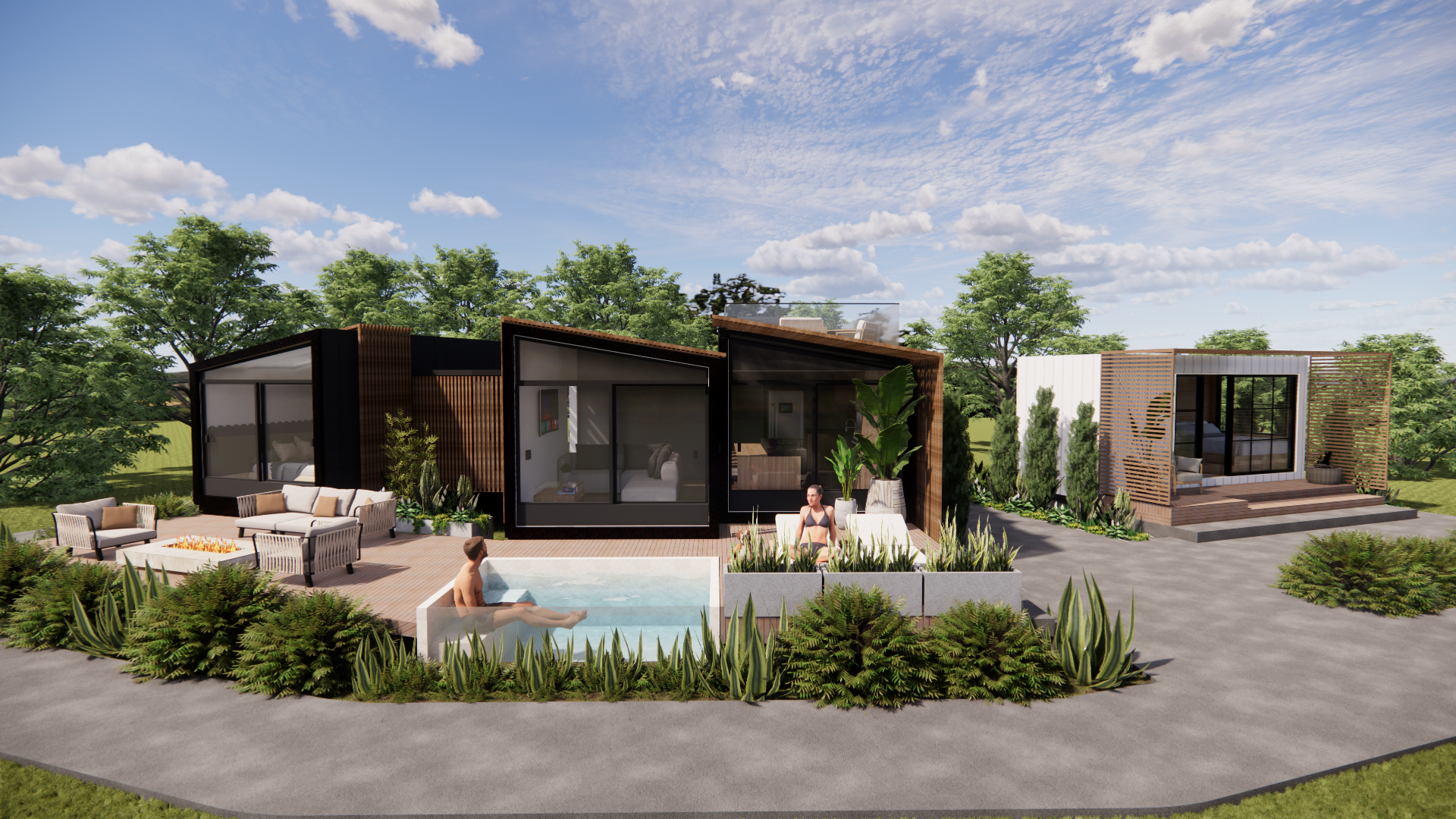 Medidas del Proyecto: 3 módulos 6m x 3m – 54m2 Lobby de acceso – 6m2 Terrazas exteriores DECK – 40m2 Cuerpo de agua – 6m2 Área 106m2