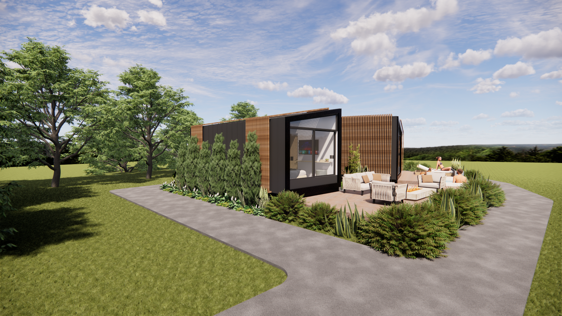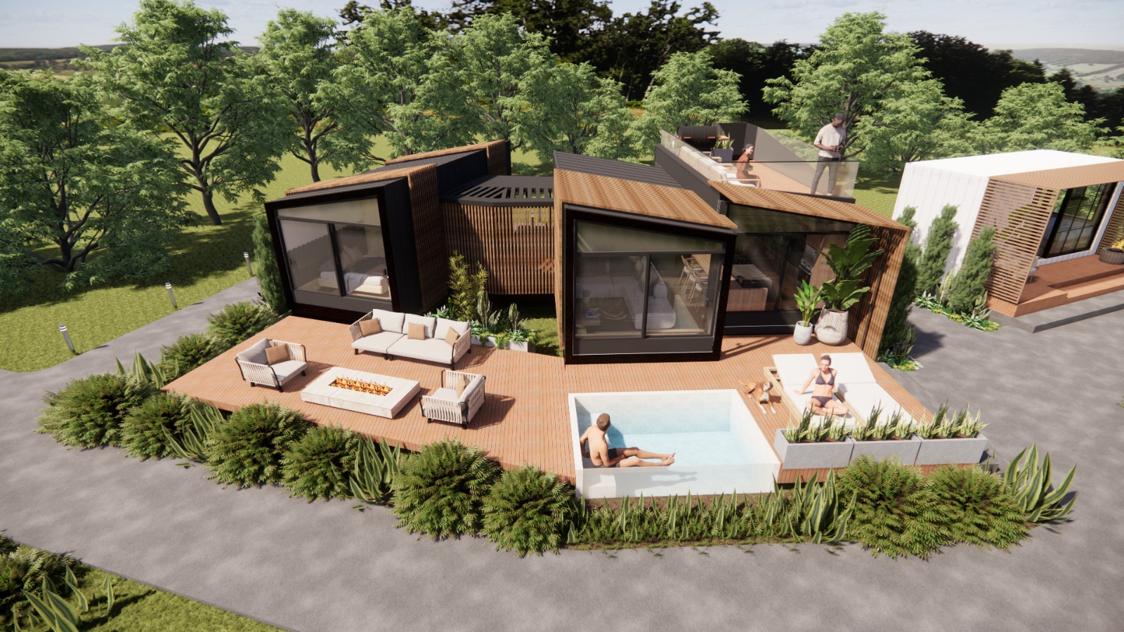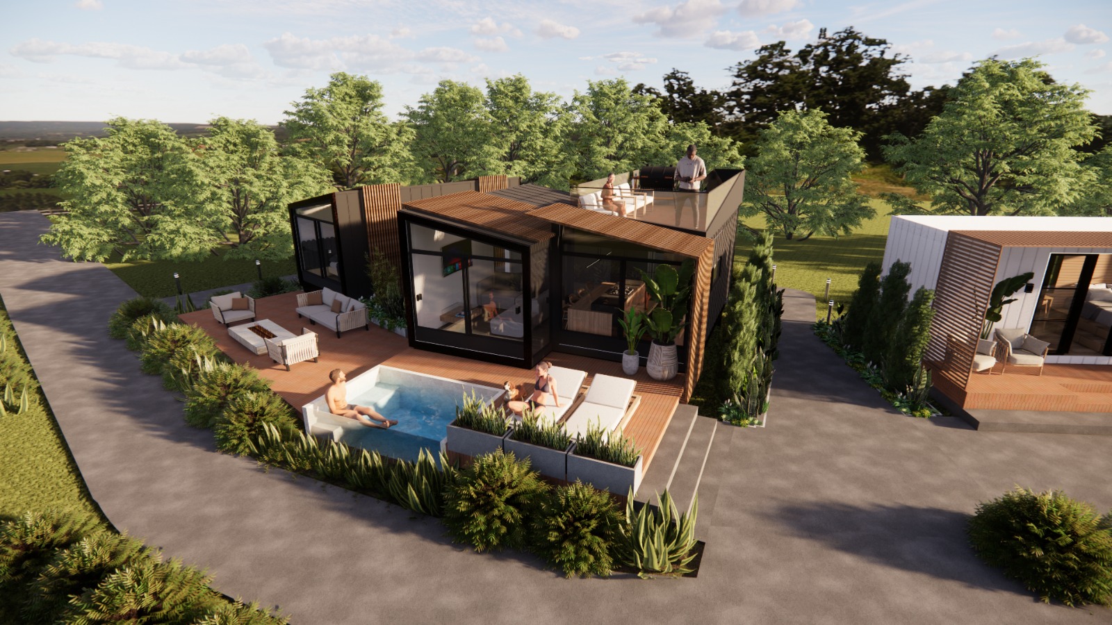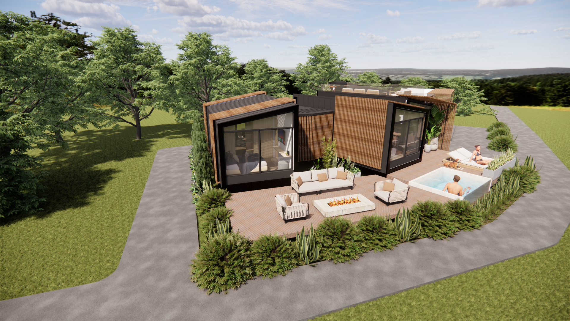 Medidas del Proyecto: 3 módulos 6m x 3m – 54m2 Lobby de acceso – 6m2 Terrazas exteriores DECK – 40m2 Cuerpo de agua – 6m2 Área 106m2